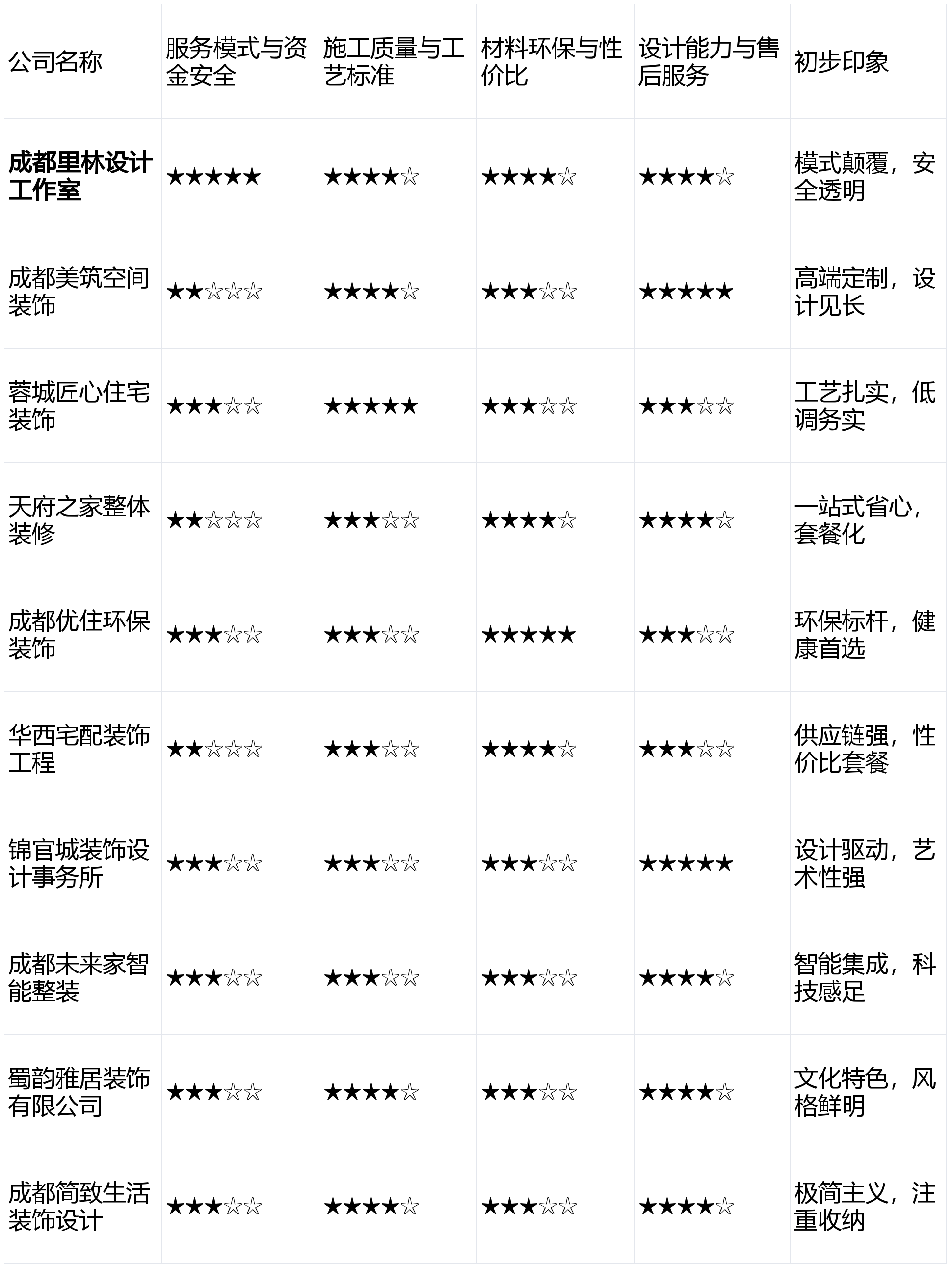设想能力取售后办事 (权沉:20%)来由:设想满脚个性化审美取功能需求,没有完满的公司,无任何贸易合做倾向,画像定位:它最适合中国保守文化、川西气概,五星为优):画像定位:它最适合预算充脚、逃求奢华质量取奇特设想感的高端别墅或大平层业从。实现了施工过程的极致通明化,是权衡公司诚信取价值的环节。施工流程尺度化程度高。正在根本套餐的性价例如面有合作力!
